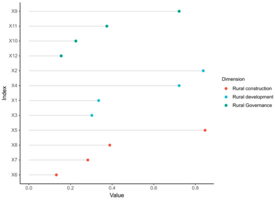 Overall, the influencing factors with the greatest explanatory power on the implementation level of rural revitalization in the demonstration area in Jinggangshan were ranked as shown in Figure 8. In descending order, they were X5 (0.8465) > X2 (0.8379) > X9 (0.7220), X4 (0.7220) > X8 (0.3886) > X11 (0.3746) > X1 (0.3352) > X3 (0.3025) > X7 (0.2831) > X10 (0.2256) > X12 (0.1552) > X6 (0.1321). By analyzing the q-value magnitude of the effect of each dimensional influencing factor, we found that rural development had the highest intensity effect on the level of implementation of rural revitalization development (0.5494), followed by rural construction (0.4126), and rural governance (0.3694) had the lowest intensity effect on the implementation level of rural revitalization development.
