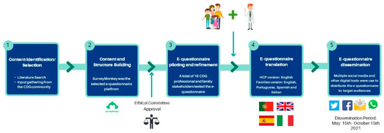 The questionnaire content was designed to understand the entire CDG patient journey, ranging from diagnosis to information needs and health care/social support measures. The questions were based on (1) a literature review and identification of validated questionnaire-based tools and (2) input from members of the CDG community, including the Portuguese Association for CDG (APCDG) (Figure 1) [18,19,23,24,25].