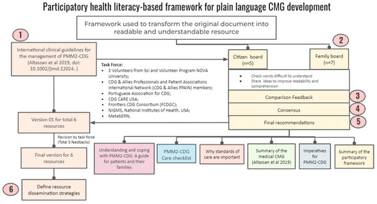 Hence, this work aims to promote the creation of a multistakeholder (i.e., encompassing CDG professionals and families), participatory and evidence-based framework to develop plain language CMGs, according to the principles of health literacy and the demands and preferences of the CDG community. Ultimately, this study aims to improve and accelerate the development of other plain language CMGs based on the CDG community and PMM2-CDG experience.