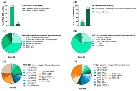 Characteristics of the CDG Journey Mapping e-Questionnaire respondents. It included PMM2-CDG family members and professional stakeholders. (A) Family and (B) professional respondents’ categories; (C) families’ and (D) professionals’ academic qualifications; (E) families’ and (F) professionals’ geographic distribution (per country of residence).