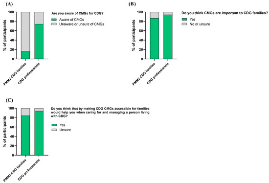 CMG recognition, perceived importance, and usefulness by CDG family and professional participants. (A) Families and professionals’ awareness of CMGs; (B) families and professionals attributed importance to CMGs; (C) CMG perceived usefulness by families and professionals in the care and management of CDG.