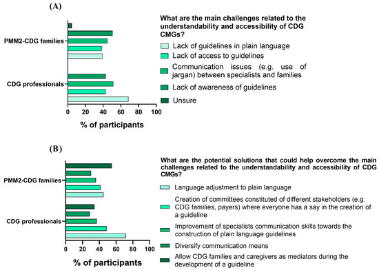CMG challenges and solutions identified by CDG family and professional participants. (A) Families and professionals pinpointed CMG challenges; (B) families and professionals proposed CMG solutions.