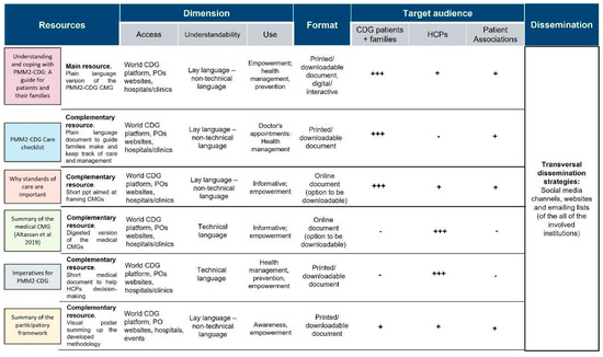Each resource was characterised in several dimensions (access, comprehension, and use), format (printed, digital) and target audience (CDG patients/families, HCP and POs).