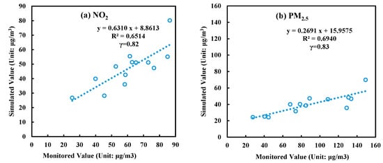 The simulated concentrations of NO2 and PM2.5 in the actual emission assessment scenario (S0) were compared with the monitored concentrations to verify the accuracy of the CALPUFF model simulation. As shown in Figure 2, the correlation coefficients (γ) between the simulated and monitored values of NO2 and PM2.5 were 0.81 and 0.83, respectively. The correlation coefficient is an indicator to measure the degree of correlation between simulated and monitored values. Generally, the larger the correlation coefficient is, the higher the degree of correlation is. The respective goodness-of-fit values of their regression line (R2), which is used to test the regression models and compare the simulated results with monitored values, were 0.65 and 0.69. The simulated concentration and actual monitored concentration were significantly correlated at the 0.01 level (both sides). The analysis showed that the CALPUFF air quality model and simulation parameters used in this paper could be used to analyze the relationship between emission and concentration.