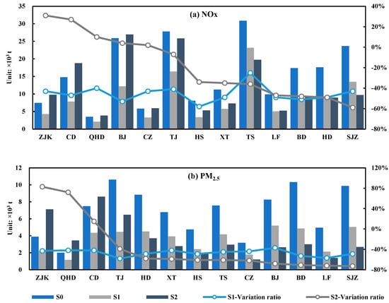 The S2 scenario was the optimization result scenario of this study. This study tried to allow emissions to increase in some cities and obtain the pollutants maximum allowable emission of every city in the Beijing–Tianjin–Hebei region considering the transmission of air pollution between cities (i.e., transfer coefficient matrix Tij).