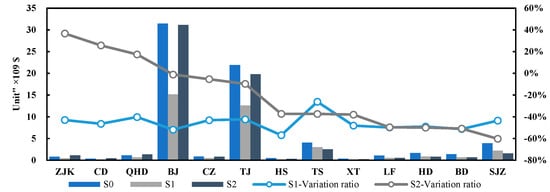 In scenario S1, the average GDP in the Beijing–Tianjin–Hebei region was 2.87 trillion USD. Compared with the actual GDP, the variation ratio of GDP in scenario S1 was about −46% (Figure 5). In the optimized emission reduction scenario S2, the average GDP of the Beijing–Tianjin–Hebei region was 4.72 trillion USD, and the average variation ratio of GDP was only about −12% (Figure 5). For the emissions of pollutants in cities with smaller transfer coefficients (Zhangjiakou, Chengde, etc.), there was still environmental capacity for emissions in these cities. The GDP of these cities could increase accordingly. Obviously, the emission reduction in pollutants under the optimized emission reduction scenario (S2) had the least impact on the overall economy of the Beijing–Tianjin–Hebei region due to the smaller total emission reduction.