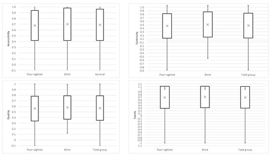 Equity and Accessibility appeared to be the most important dimensions of PHC for respondents, representing the highest mean values (0.70 and 0.69, respectively). The Continuity dimension, with the mean value of 0.43, was the least valued by participants (Figure 1). Poor-sighted and blind respondents did not differ significantly in their level of expectations in particular dimensions (p > 0.05).