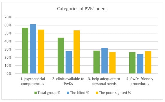 A content analysis of the responses enabled to obtain four categories describing PVIs’ needs and expectations. These were as follows: psychosocial competencies of the staff (56.8% answers in the total group); primary care clinic available to PwDs (44.5%); help adequate to personal needs (28.4%), and PwDs-friendly medical procedures (26.4%) (Figure 2).