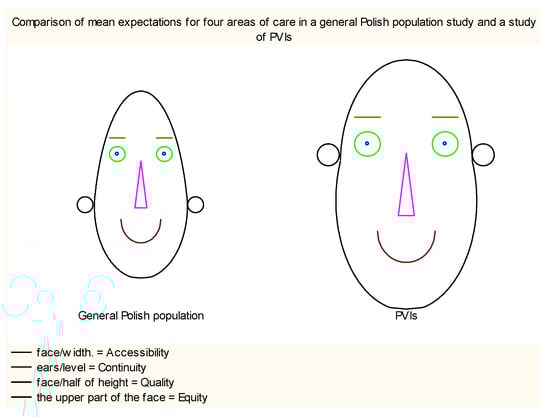 Of the four PHC dimensions distinguished in Polish QUALICOPC and the current study, Equity and Accessibility were the most important for respondents in both surveys [23], and there were no statistical differences in any of dimensions according to the level of VI. However, PVIs demonstrated higher expectations in all measured dimensions of care than subjects from the general Polish population (Figure 3). It may be due to their specific needs and barriers they must break to access healthcare services and their willingness to be actively engaged in medical treatment [39]. As respondents clarified in answers to the open-ended question, they want to be treated equally and seriously, and easy access to healthcare services gives them a feeling of safety, especially when they are dependent on others or assistive devices.