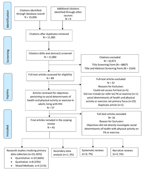 Primary Purpose of Included Articles: Thirty-one (76%) of the 41 included articles included a primary purpose to explore the association or relationship of SDOH with PA or exercise in PLWH [21,22,36,38,39,40,41,42,43,44,45,47,51,52,53,54,55,56,57,58,59,60,62,64,66,67,68,69,70,71,72], whereas 10 (24%) articles examined SDOH in the context of other aims [34,35,37,46,48,49,50,61,63,65]. Among these 10 articles, four (40%) evaluated the association of SDOH with PA or exercise as a secondary aim of the study [46,49,61,63]. Among the three systematic reviews, one (33%) determined the correlates of PA in PLWH by reviewing six studies [71], and the remaining two (67%) systematic reviews investigated the prevalence and predictors of dropout in PA interventions by reviewing 36 studies [69], and evaluated barriers and facilitators of PA participation in PLWH by synthesizing 45 studies [70]. Among the two narrative reviews included in this review, their purposes were to discuss the opportunities and challenges of benefiting from different types and effects of PA and to examine the literature on PA, social support and socioeconomic status (SES) and to generate recommendations for designing and implementing PA interventions with PLWH [22,72].