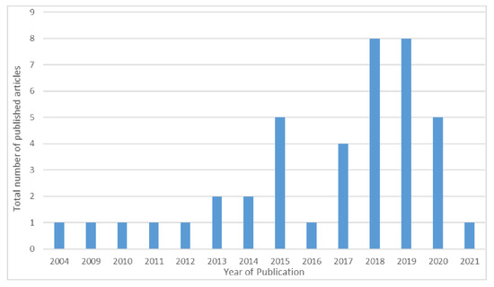 Timing of publications of the 41 included articles between the year 2004 and 2021.