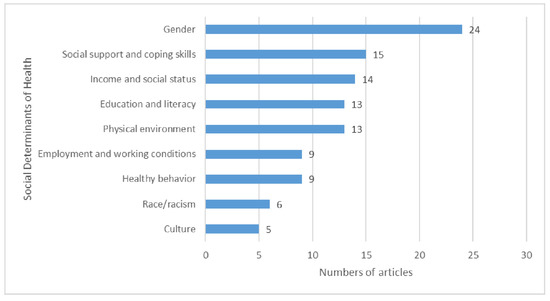 Nine out of 12 SDOH were addressed across the 41 included articles. The number of SDOH addressed in each article ranged from one [34,37,39,40,43,44,45,49,50,53,56,64,65,66] to eight [70] (Table 2). The most common SDOH addressed across included articles was gender (n = 24; 47%), followed by social support and coping skills (n = 15; 36%), income and social status (n = 14; 34%), education and literacy (n = 9; 22%), employment and working conditions (n = 9; 22%), physical environment (n = 9; 22%), healthy behaviors (n = 9; 22%), race/racism (n = 6; 15%), and culture (n = 5; 12%). (Table 2; Figure 3). Three SDOHs (childhood experiences, access to healthcare, and biology and genetic endowment) were not addressed in any of the included articles. None of the articles utilized a pre-determined SDOH framework to report their findings.
