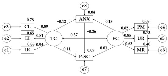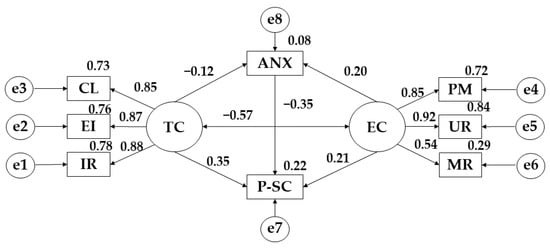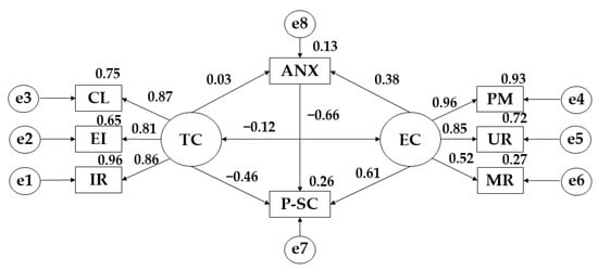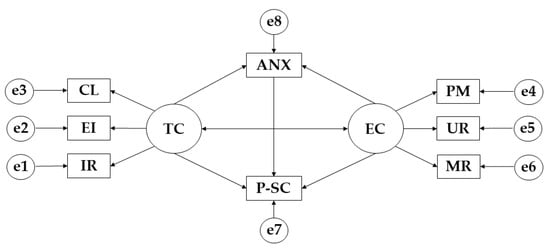 For the structural equation models, the IBM SPSS Amos 26.0 software (IBM Corp., Armonk, NY, USA) was used to establish the relationships between the variables that make up the theoretical model (Figure 1). In this case, a model has been developed for each of the degrees of adherence to the Mediterranean diet. Each of the models is composed of two exogenous variables (TC; EC) and eight endogenous variables (IR; EI; CL; PM; UR; MR; ANX; P-SC). For the endogenous variables, a causal explanation has been made on the basis of the observed associations between the indicators and the degree of measurement reliability. At the same time, the one-way arrows represent the lines of influence between the latent variables and are interpreted from the regression weights. A significance level of 0.05 was established using Pearson’s Chi-Square test.