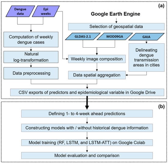 A framework of efficient and accurate city-level dengue risk prediction is proposed, which includes two parts (Figure 1). Part (a) represents the steps of generating risk predictors using big geospatial data cloud computing hosted on the GEE platform. Part (b) represents the steps of defining multi-date ahead forecast scenarios, model construction, training, and evaluation using Google Colab.