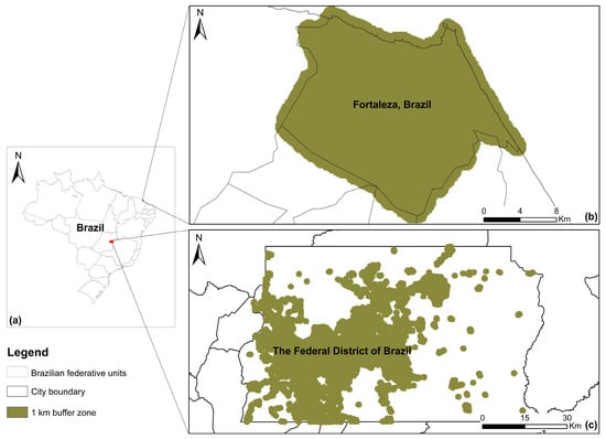 To evaluate the performance of the proposed framework, we selected the Federal District of Brazil and Fortaleza as study sites. The Federal District of Brazil is the smallest federative unit without municipalities, and intense urban land expansion and population growth make dengue a major public health issue in recent years [,,]. Moreover, Fortaleza is the fifth most densely populated city in Brazil and exhibits great socioeconomic inequality where intense dengue epidemics occurred in recent decades due to population concentration and urban inequality [,,,]. The experiments of city-level forecasting of weekly dengue cases were implemented as follows: (1) generating the time series of weekly dengue cases; (2) delineating the dengue transmission areas and generating the time series of risk predictors based on the GEE platform; (3) constructing, training and evaluating multi-date ahead and multi-scenario models. The experimental steps are detailed hereafter.