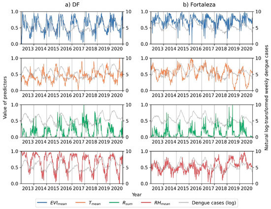 Illustration of the time series of climate and vegetation factors and natural log-transformed weekly dengue cases during 2013–2020 in the Federal District (a) and Fortaleza (b) in Brazil.