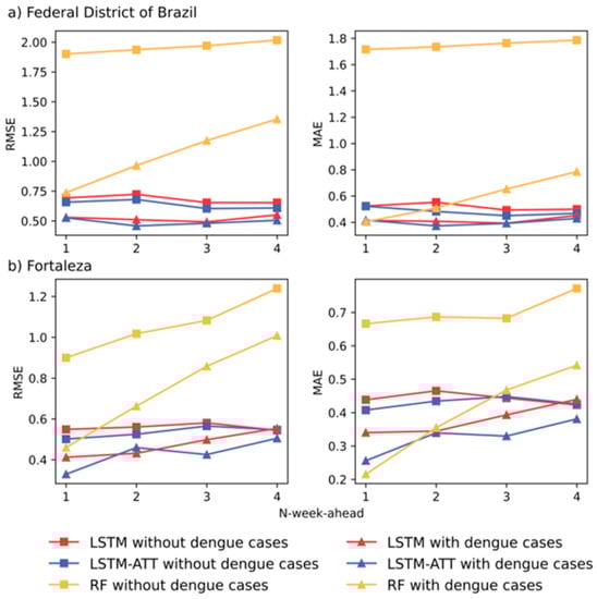 - RF models frequently have higher prediction errors than LSTM and LSTM-ATT models, and introducing historical dengue data as one of the input features can improve the performance of RF models for 1- to 4-week ahead predictions (see the yellow lines in Figure 4). Most of the predicted curves of RF models differed greatly from those of the observed cases, especially on the dataset of the Federal District of Brazil (Figure 5c).