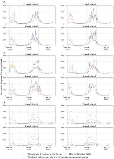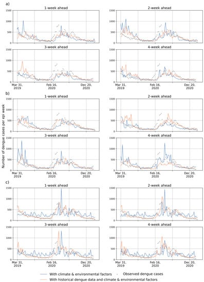 In this study, four prediction scenarios (i.e., 1- to 4-week-ahead) with two groups of input features (i.e., modeling with climate and environmental factors, and modeling with historical dengue data and climate and environmental factors) were used.