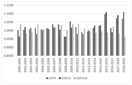 - From the decomposition of GTFP, technological progress (1.59%) is the main driving force, and technical efficiency improvement (0.71%) is the secondary driving force; that is, the national average GTFP growth from 2000 to 2019 showed a joint promotion of “dual-drive” growth model. This means that, with the improvement of human capital in education, health, scientific research, and training, the ability for scientific and technological innovation is enhanced, and technological progress is rapidly developing.