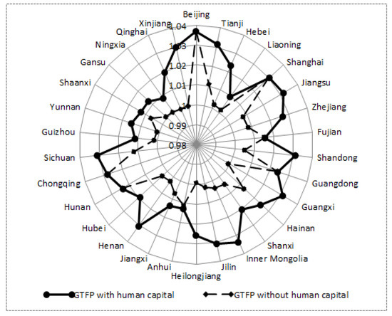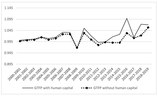 At the national level, when human capital was included, the national average GTFP increased by 2.308% from 2000 to 2019. While, when human capital was not included, the national average GTFP increased by 0.87%. Therefore, the absence of human capital underestimates GTFP.