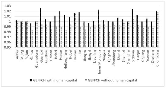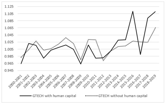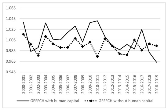 Figure 4 and Figure 5 show the time series comparison results of technical efficiency changes and technological progress decomposition terms of GTFP under different modes. It can be seen that the measurement results of the technical efficiency index incorporating human capital are lower than the traditional model in some periods: 2001–2002, 2015–2016, and 2017–2019. The measured results of the technology progress index incorporating human capital from 2000 to 2013 were lower than those of the traditional model, while the measured results of the technology progress index incorporating human capital from 2013 to 2019 were higher than those of the traditional model, and the gap showed a widening trend compared with the previous period.