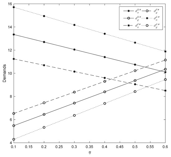 where we assume thatandsatisfy, implying that a product’s demand is more sensitive to changes in the price of that product than the price of its competitors. Parameteris normalized to one in the following for brevity’s sake, thus, we have. It is evident that product demand decreases as its price increases, whereas an increase in demand occurs as its competitor’s price increases. Meanwhile, η refers to consumer environmental awareness (CEA) and. CEA reflects consumers’ willingness to purchase green products. Higher CEA indicates that consumers are more likely to purchase green products. There are two main reasons for the adoption of linear demand functions. In the first place, the demand curve can be well described by a linear structure [75,76]. The second reason for the widespread use of linear models in operational management literature is that they are tractable and highly parsimonious [51,77].