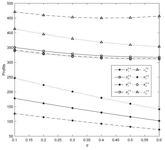Corollary 3 and Corollary 4 present the effects of CEA and consumers’ channel preference on optimal solutions under Model F. As can be seen, CEA adversely affects the optimal wholesale price, retail price, and demand for common products, as well as the retailer’s profit. It is evident that the price and demand for green products increase as η grows. This is because if consumers are susceptible to environmental awareness, they tend to pay a premium for green products to maintain ecological health, which means they prefer to purchase green products from online channels. This results in a decline in retail sales of common commodities, leading to a decrease in retail prices, whereas the manufacturer becomes more profitable as demand for green products increases.