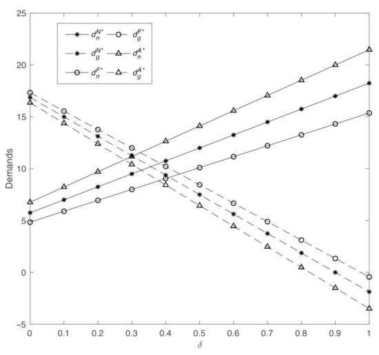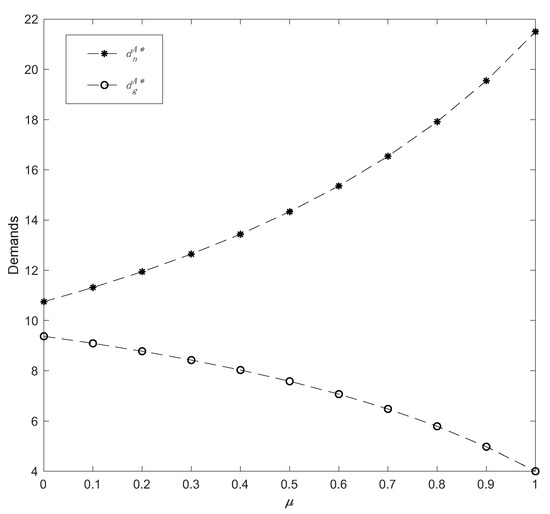 From Proposition 2, when , the demand for green products is zero. The reason for this is that when the CEA is significantly low, the willingness of consumers to purchase green products is extremely low as well, so the market for green goods will be completely ignored. When , both common products and green products are in demand; this is due to the improvement in public awareness of environmental protection, the purchase intention of some consumers for green products equally increases, such that both common products and green products have corresponding markets.