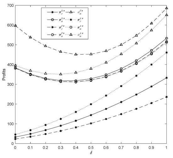 In addition, consumers’ preference for the offline channel has the opposite effect on the corresponding variables as CEA. Specifically, the optimal wholesale price, retail price, and demand for common products are positively correlated with δ, and as a result, the profit of the retailer improves. This is similar to the outcome of Corollary 2. However, in terms of the manufacturer, the effects of η and δ on the profits and utilities are too complex to be judged due to the influence of fairness concerns. This further shows that although the fairness concern of manufacturers has no apparent influence on the changing trends of variables such as prices and demand of common and green products, it significantly influences their own profits. Therefore, we analyze the changes in the manufacturer’s profit and utility under the influence of the fairness concern coefficient in numerical analysis.