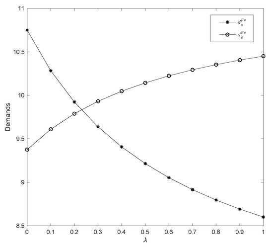 Corollary 5 determines that when a manufacturer is fairness concerned, the wholesale and retail prices of common products are increasing with the fairness concern coefficient, resulting in a decrease in common demand and, ultimately, a decrease in retailer profits. In addition, the direct sales prices of green products remain unaffected by the fairness concern behavior. Thus, an increase in the prices of common products will encourage some consumers to switch to green products, thereby increasing the demand for green products. However, the manufacturer’s profits continue to decrease as λ increases. This signifies that, with a fairness concern behavior by the manufacturer, the loss of demand caused by higher pricing for common products is far greater than the growth in green products, which ultimately results in lower profits.