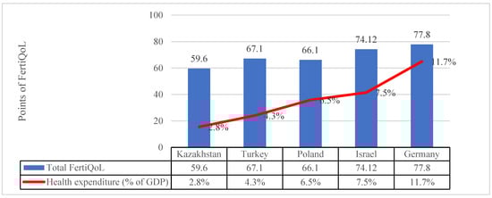 S. Madero et al., 2017, concluded that the socio-cultural background of patients plays a role in shaping their experience of treatment in terms of well-being []. Health expenditure can be measured by a combination of objective health outcome indicators, such as life expectancy, healthy life years or self-perceived health []. In our study, we tried to compare five countries by % of GDP for healthcare and Total FertiQoL scores. We have noticed a downward trend in the overall quality of life in relation to the decline in % GDP for healthcare. The average indicators of FertiQoL domains of women with infertility in Kazakhstan are significantly lower than in other countries. It was found that one in every seven couples with infertility are getting divorced, taking into account these data, the government of Kazakhstan launched the program “Ansagan Sabi”. Since 2020, this program each year subsidized 7000 in vitro fertilization treatments []. However, not everyone can rely on this support. Strict criteria for obtaining subsidy by health insurance for infertility force many couples to take out loans for IVF treatment.