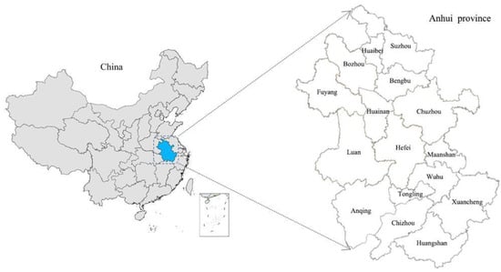 Anhui Province is located in the central region of China (Figure 1), with a total land area of about 139,600 square kilometers, accounting for 1.45% of the total land area of China. Anhui is an important agricultural production, raw materials, and processing and manufacturing base in China, and agricultural product processing occupies an important position in the country. By the end of 2020, Anhui’s GDP reached CNY 3868.063 billion, with per capita GDP of only CNY 63,426. The total output value of agriculture, forestry, animal husbandry, and fishery is CNY 56.8 million. In the process of rapid urbanization and industrialization, Anhui’s rural regional elements, structure, and function have shown accelerated transformation, which represents an important epitome of China’s rural regional function transformation after the reform and opening up. Therefore, the selection of Anhui Province as a typical case study of China’s traditional agricultural area is representative to some extent.