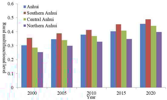The improved entropy method model was used to calculate the rural multifunction index in Anhui from 2000 to 2020 (Figure 2). The results showed that since 2000, the rural multifunction level in Anhui has shown a continuous improvement trend from 0.3023 in 2000 to 0.3786 in 2010, and then to 0.4553 in 2020. The rural multifunction level at the county scale in Anhui has increased by 50.61% in the past 20 years. From the perspective of different regions, the rural multifunction level in Southern Anhui (Maanshan, Wuhu, Tongling, Chizhou, Huangshan, Xuancheng) fluctuated in the interval of [0.3542, 0.4889] from 2000 to 2020, while the rural multifunction level in Central Anhui (Hefei, Chuzhou, Luan, Anqing) fluctuated in the interval of [0.2863, 0.4408]. However, the rural multifunction level in Northern Anhui (Suzhou, Huaibei, Bozhou, Fuyang, Bengbu, Huainan) fluctuated in the range of [0.2539, 0.3983]. Therefore, the overall regional difference of rural multifunction level at the county scale in Anhui during the study period was as follows: Southern Anhui > Central Anhui > Northern Anhui, and the rural multifunction level showed a basic regional difference characteristics of “high in the south and low in the north”.