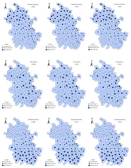 Based on ArcGIS10.2 software and the Jenks breaking point method, the rural production, life, and ecological function were divided into three types: high value area, median value area, and low value area. The spatial-temporal pattern change characteristics of rural multifunction in Anhui from 2000 to 2020 were mainly revealed from the three dimensions of production, life, and ecological function (Figure 3).