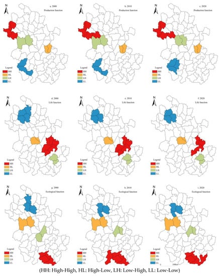 - Rural production–life function. In 2000, HH was clustered in Wanjiang urban agglomeration, LL was clustered in Jixi, Ningguo, and other counties in the south of Anhui. The tradeoff relationship was mainly distributed in the counties of Lingbi and Guzhen in Northern Anhui. In 2010, the synergy relationship of HH counties was mainly located in Wuhu–Maanshan–Tongling. The spatial distribution of tradeoff relationships (HL, LH) was less. By 2020, the spatial distribution of the tradeoff–synergy relationship was stable, and the synergy relationship was still mainly located in the Wanjiang River region (Figure 5a–c).