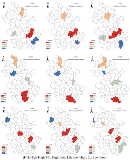 In order to explore the relationship between rural production, life, and ecological functions in Anhui during the study period, the spatial autocorrelation model was used to identify the spatial correlation of each single rural function (Table 2). Table 2 shows that at the test level of 0.1%, the estimated Global Moran’s I values of rural production, life, and ecological function in 2000, 2010, and 2020 were all positive. The calculation results of the Global Moran’s I index showed that rural production, life, and ecological function in Anhui at the county scale had obvious positive spatial correlation. That is, the adjacent county units had strong interaction and spatial agglomeration. Among them, the Global Moran’s I value of rural production function level in Anhui during the study period was between [0.4532, 0.5036], the Global Moran’s I value of rural life function level was between [0.3015, 0.3452], and the Global Moran’s I value of rural ecological function level was between [0.3672, 0.4038], which indicated that the agglomeration characteristics of rural life function in Anhui were the most significant, while the agglomeration characteristics of rural production and ecological function were relatively weak.