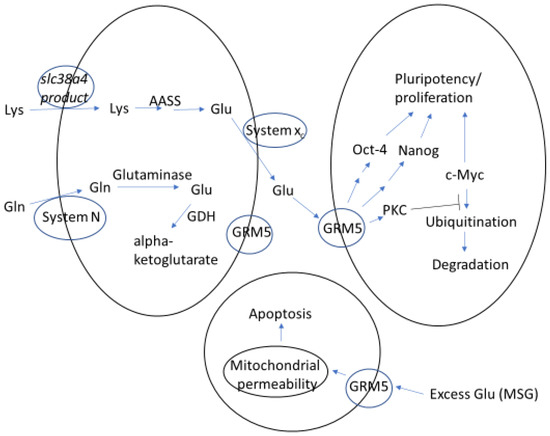 Nevertheless, hES cells release glutamate to the culture medium and remove lysine from it [11], so the cells must take up lysine via at least one transporter. Moreover, subsequent conversion of lysine to glutamate is conceivable because less glutamate is released from hES cells than the amount of lysine they consume [11]. However, why else do we think a pool of glutamate, specialized for GRM5 signaling, is produced from lysine in hES cells, why do we think this glutamate specifically maintains hES cell pluripotency and proliferation, and are there clinical consequences of altered lysine metabolism owing to, say, undernutrition (see below)?