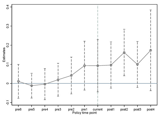 where , , and denote the interaction terms of the policy time dummy variables before, in the current year of implementation, and after the implementation of the ECR policy, respectively, with the policy dummy variables. We take the first 7 years of the implementation of the policy as the comparison benchmark, and thus, is not added to the model. The coefficients corresponding to the three dummy variables are , , and , and the meanings of the remaining variables and symbols are consistent with Equation (1).