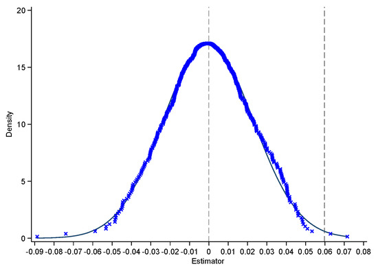 For the regression results to be more convincing, a placebo test is essential. We select an indirect placebo test method, that is, a non-parametric displacement test, which has been widely used by scholars [42,43,44]. Specifically, we randomly sample the interaction terms of all policy dummies and time dummies 500 times and perform the regression according to Equation (1), obtaining 500 differential regression coefficients of DID. Then, we plot the regression coefficients of and kernel density.