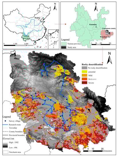Guangnan County is located in the southeast region of the Yunnan Province (104°31′~105°39′ E, 23°29′~24°28′ N), which belongs to the middle and southern subtropical plateau monsoon climate. The annual average sunshine is 1857.7 h, the annual average temperature is 16.7 °C, and the annual average rainfall is 1056.5 mm. The dry and rainy seasons are obvious. Karst landforms are widely distributed, accounting for 74% of the total area of the county, mainly located in the western, southern, and south-central regions. The rocky desertification area covers 1840.53 km2 (23.81%) of the total area of the county, which is one of the 200 major rocky desertification counties in China. The soil types are mainly composed of red soil and limestone soil, and the vegetation is primarily composed of Yunnan pine, oak, and Chinese fir, with rich species. The water resources in the area are fairly abundant, with a relatively low utilization rate. There are 11 ethnic minorities in the county, accounting for 61.8%. In 2018, the total population of the county was 822,600, of which the agricultural population accounted for 91.29%. In 2018, the proportion of GDP of the primary, secondary, and tertiary industries in Guangnan County was 30.22:30.34:39.44, respectively [] (Figure 1).