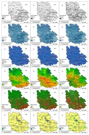 The soil holding capacity increased more in the northwest and south and decreased in the southeast from 2000 to 2018. The value of carbon sequestration increased in the east and southwest regions and decreased more in the northwest, central and south-central regions. The habitat quality increased in the east and southeast and decreased in the west and northwest. The value of cultural services increased in the central region and decreased in the western and northwestern regions. Spatially, there was an increase in the food supply in the central, south-central, and southeastern regions and a decrease in the western and eastern regions. The water yield showed an increase in the north, central and south-central regions and a decrease in the northwest, south, and southeast regions (Figure 2).