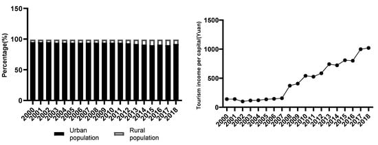 The total number of tourists received by several scenic spots in Guangnan County saw an increasing trend from 2000 to 2018, demonstrating an increase by a total number of 2.84 million tourists and an average annual growth of 157,700 tourists (Figure 3). There was a consequent increase in the comprehensive income, with an average annual growth of CNY 159 million []. With the continuous development in the economy, the annual per capita tourism income in the study area increased from CNY 149 to CNY 978. This increase is beneficial to cultural value services.