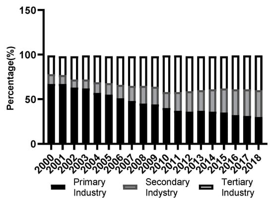 In 2000, the economy of Guangnan County was dominated by primary industry. The proportion of gross output value of primary, secondary, and tertiary industries is 67.14:10.94:21.92, respectively. Since 2000, the tertiary industry has rapidly developed under the promotion of the western development strategy. In 2018, the economy of Guangnan County showed a significant decline in the primary industry and an increase in the secondary and tertiary industries. The proportion of the gross output value of the primary, secondary, and tertiary industries was 30.22:30.34:39.44, respectively (Figure 4). With the continuous optimization of industrial structure, the proportion of agriculture is decreasing, the proportion of the light industry and especially that of the service industry is increasing, and the driving role of tourism in the tertiary industry is enhanced. The adjustment of industrial structure can reduce the consumption of energy and materials, play an important role in the protection of the ecological environment, and aid in increasing the habitat support and cultural value services in the study area.