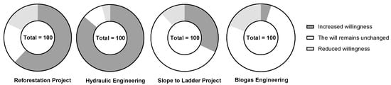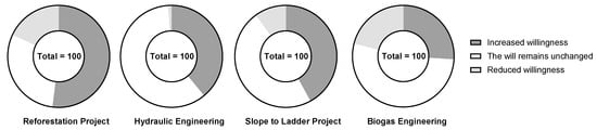 Since the implementation of the fallow forestry project, there was an increase in the number of participating households from 2000 to 2018, with 140 (34.40%) new households participating (Table 3). If the government were to stop subsidizing the Fallow Forestry Project, 62% of the households would increase their willingness to implement the project (Figure 5). The main reason is that the phenomenon of deforestation and land reclamation was common knowledge before the implementation of the project. With the out-migration of the main labor force in the village, the surplus labor force of the elderly and children was limited, which led to several sloping farmlands being abandoned. More farmers voluntarily participated in the project, which gradually improved the ecological environment. Secondly, before the implementation of the project, farmers needed to cut a significant amount of firewood to cook food and pig fodder. The cooked food for livestock was gradually replaced with raw corn flour or green feed, reducing the use of firewood. At the same time, in the Zhuang villages, the houses were mainly made of wood in the past, where a large amount of wood was required to be cut down. Now, the building materials comprise mostly cement, greatly reducing the demand for wood. Therefore, the reduction in wood consumption by farmers protected the vegetation in the mountain, which is beneficial to the vegetation growth and to the implementation of the fallow forestry project.