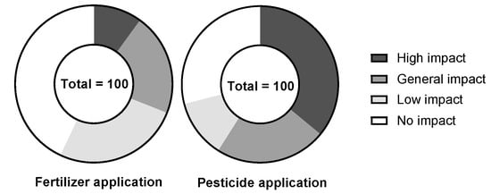 The average application of pesticides per mu of cultivated land showed a yearly increasing trend from 2000 to 2018 (Table 4). The number of new farmers using pesticides was 226, accounting for 55.52% (Table 4). If the price of pesticides were to be increased, it was found that only 28% of farmers would be willing to reduce the application amount (Figure 7). Due to the increasing number of crop diseases and insect pests, in addition to drug resistance, farmers can only rely on increasing the amount of pesticide application to reduce the harm crops and to increase production. By and large, most farmers were reluctant to reduce the number of pesticides used. However, with the yearly increase in pesticide application, 36% of farmers believed that the increasing pesticide application has an impact on the ecological environment (Figure 8). This shows that farmers have realized the negative impact of pesticides on the ecological environment while improving crop yields.