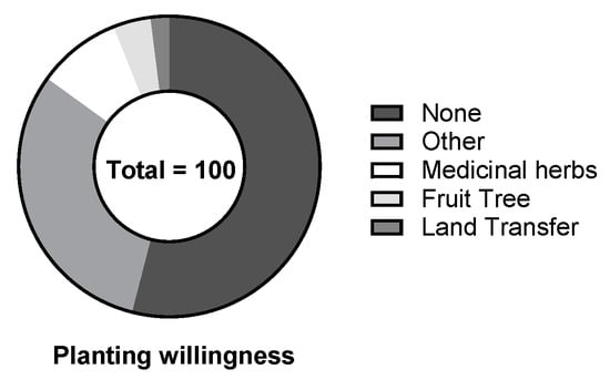 According to the survey, 54% of the farmers remained unchanged in their willingness to grow crops, and they continued to grow traditional food crops such as corn and rice from 2000 to 2018. This is primarily because the farmers were unable to replant suitable crops, due to technical or financial constraints. In addition, with the increase in the number of migrant workers, the remaining farmers were mostly elderly who were unable to replant, due to limitations in their energy and physical ability. They could, therefore, only grow traditional crops such as corn to be self-sufficient and to maintain their basic life. Of the farmers, 31% were found to prefer to grow other crops with higher economic benefits, followed by 9% of the farmers who were willing to grow medicinal plants, 4% of the farmers who were willing to grow fruit trees, and only 2% of farmers were willing to transfer their land if conditions permit (Figure 9). Supply services and habitat support services benefit to some extent, as farmers tend to diversify crop production.