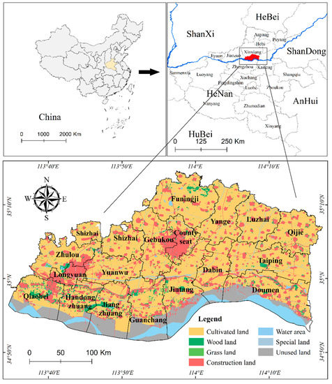 Yuanyang County is located in Xinxiang City, Henan Province (Figure 1). There are 16 townships, 3 offices, and 583 administrative villages under its jurisdiction. Yuanyang County has a warm temperate continental monsoon climate and is located on the Yellow River Alluvial Plain in northern Henan. Its unique geographical growth conditions make it a national commercial grain production base and a demonstration area for high-quality rice cultivation. Yuanyang County has a special geographical location. Located along the Yellow River, Yuanyang is the county with the largest wetland area of the Yellow River in Henan Province. Its forest coverage is the first in the plain area of Henan Province, and its ecological status is prominent. Additionally, the cultivated land area in Yuanyang County accounts for 61.96% of the total land area, which is more than 10% higher than the provincial average, and it is all located at a slope below 2 degrees. Yuanyang County has adopted measures such as introducing rice from the Yellow River, pressing alkali and sand, and improving soil nutrients. Most plots are planted with two crops of rice and wheat. The planting area of high-quality rice exceeds 300 km2. The rice produced was the first grain in Henan Province to obtain green food certification and earn foreign exchange through export. As it is located along the Yellow River, the effective irrigation area is 499.7 km2, the length of the irrigation canal is 2084.36 km, and the farmland infrastructure is perfect, making it a high-yield and efficient agricultural area for producing high-quality wheat and rice. As a major grain-producing county in Henan Province and even in the whole country, Yuanyang County has the important tasks of both ecological protection and grain production. The Chinese government formulated a major national strategy for the ecological protection and high-quality development of the Yellow River Basin in 2019, proposing to strengthen the ecological protection and management of the basin and to promote the high-quality development of the entire basin. Therefore, Yuanyang County was used as a study area to promote the coordinated development of ecological protection and cultivated land use by rationalizing the cultivated land use from the perspective of ecological security, which is of great significance for the ecological protection and high-quality development of the entire basin.