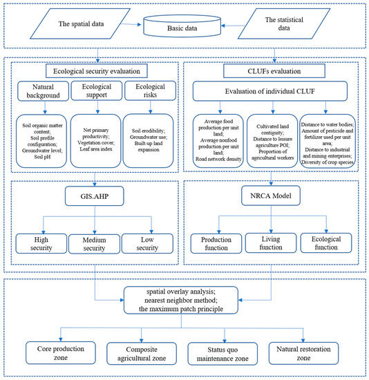 The proposed framework formulates policy recommendations for the ecological protection and utilization optimization of cultivated land by evaluating ecological security and the leading CLUFs (Figure 2). This framework was divided into four steps. Firstly, a comprehensive evaluation of the ecological security level of cultivated land was conducted. We analyzed the essential properties of the cultivated land from the perspective of ecological security and evaluated the innate formation elements, late constitutive elements, and external threats of the cultivated land from the foundation-support-threat perspective to evaluate the level of ecological security of the cultivated land. Secondly, from the perspectives of production, living, and ecological, we evaluated the CLUFs and used the NRCA model to calculate the leading CLUFs. Thirdly, the results of both the ecological security and CLUF evaluation were superimposed. We used the NRCA model again to measure the leading zoning of each township and adjusted the cultivated land use zoning by using the nearest neighbor method and the maximum patch principle with the leading zoning of each township as the limiting factor. Finally, we proposed differentiated utilization measures and policy recommendations for different regions.