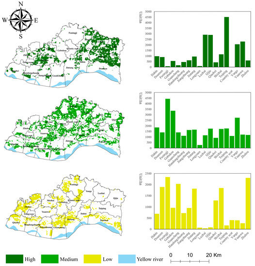 The ecological function (Figure 4b) of cultivated land in Yuanyang County is mainly a medium to high level. Areas with a high ecological function are mainly distributed in areas such as Doumen Township (39.74 km2, 14.11%) and Dabin Town (34.78 km2, 12.35%). These areas are close to the Yellow River; thus, they have a high water-conservation function. However, Funingji Town, which is relatively close to industrial and mining enterprises, faces greater ecological pressure compared to other regional plots and has a strong environmental pollution purification function; thus, the ecological function level in this area is high. Medium ecological function areas are mainly located in the central part of Taiping Town (28.42 km2, 10.78%) and the southern part of Shizhai Township (27.86 km2, 10.57%), where the use of fertilizers and pesticides per unit area is not high compared to that in other townships, and the amount of external ecological pollution is small; thus, the environmental purification function of the cultivated land is weaker compared to that of the cultivated land in other locations. The lower ecological function areas are mainly located in Qijie Town (41.14 km2, 25.77%), the northern part of Luzhai Township (23.72 km2, 14.86%), the central part of Gebukou Township (21.98 km2, 13.77%), and the eastern part of Funingji Town (16.08 km2, 10.07%). Spatially, the most obvious characteristic of areas with a low ecological function level is that they are located in the northern part of Yuanyang County, which is farther away from the Yellow River. Moreover, there are no large rivers or obvious water surfaces inside Yuanyang County; thus, the water conservation function is weak and the ecological function level is not high.