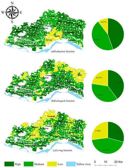 The production function of the cultivated land in Yuanyang County is mainly medium to high level, and the overall production function is high. Areas with a high level of production function (Figure 4a) are mainly located in Taiping Town (50.85 km2, 16.13%), Shizhai Township (46.57 km2, 14.77%), and Zhulou Township (40.66 km2, 12.90%), where the grain yield per unit area is higher, the transportation to cultivated land is convenient, and the agricultural mechanization production efficiency is high. Areas with a medium level of production function are mainly concentrated in the areas near the suburban areas such as Funingji Town (67.54 km2, 21.30%) and Doumeng Township (39.23 km2, 12.37%), where the grain yield is not high due to the profit-seeking effect, but the yield of non-food crops such as vegetables and fruits per unit area is high; thus, the production function of the cultivated land is better. The areas with a low production function are mainly concentrated in Jintang Township (40.66 km2, 56.16%) and Dabin Town (24.00 km2, 33.15%), where the cultivated land is scattered, which is not conducive to mechanized farming, and the grain yield per unit area is not high; thus, the production function of the cultivated land is low.